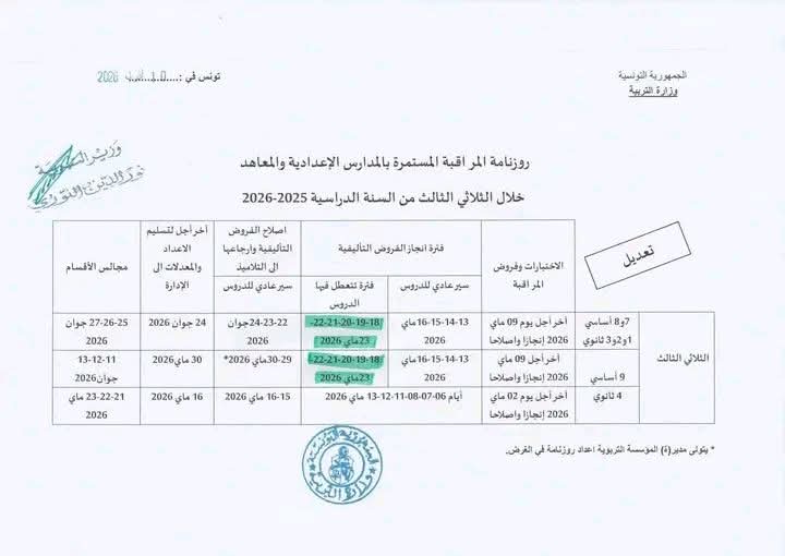 تعديل في روزنامة الثلاثي الثالث لتلاميذ المدارس الإعدادية و المعاهد الثانوية للسنة الدراسية 2025/2026
