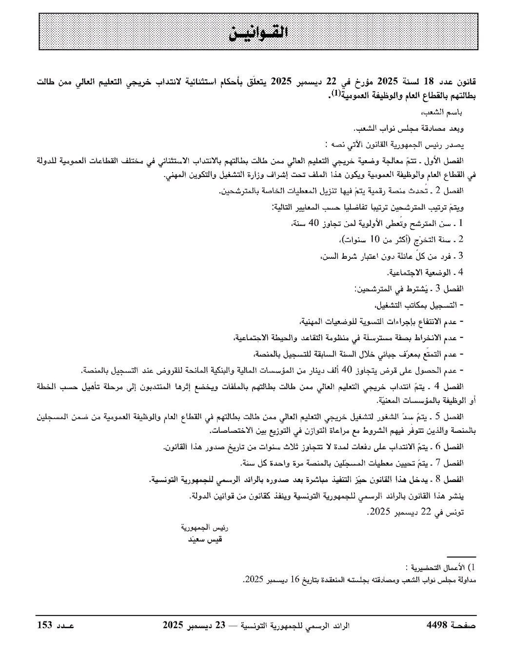 ونص القانون في فصله الأول على انه تتم معالجة وضعية خريجي التعليم العالي الذين طالت بطالتهم بالانتداب الاستثنائي في مختلف القطاعات العمومية للدولة في القطاع العام و الوظيفة العمومية ويكون هذا الملف تحت اشراف وزارة التشغيل و التكوين المهني.