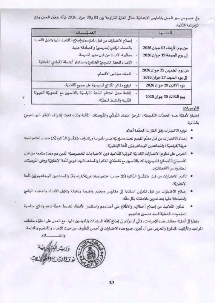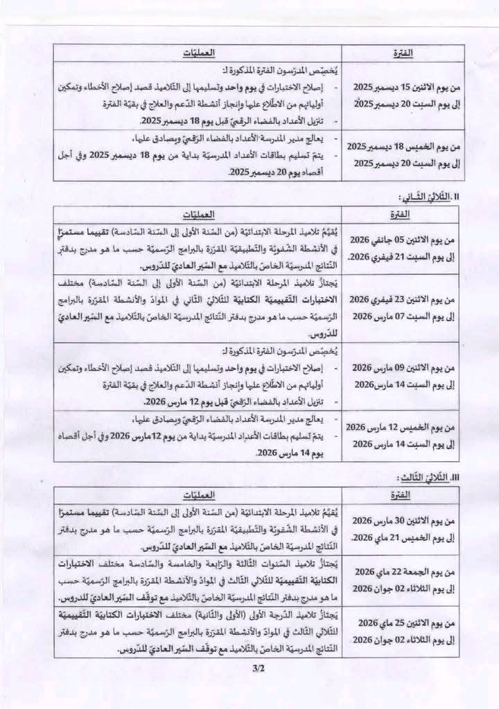 ✅روزنامة الإختبارات التقييمية الثلاثية بالمدارس الابتدائية للسنة الدراسية 2026/2025بواسطة Admin / 22 أكتوبر، 2025 ✅روزنامة الإختبارات التقييمية الثلاثية بالمدارس الابتدائية للسنة الدراسية 2026/2025