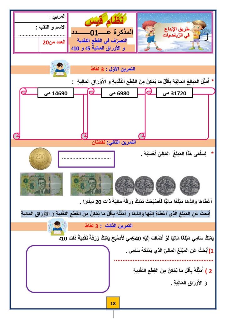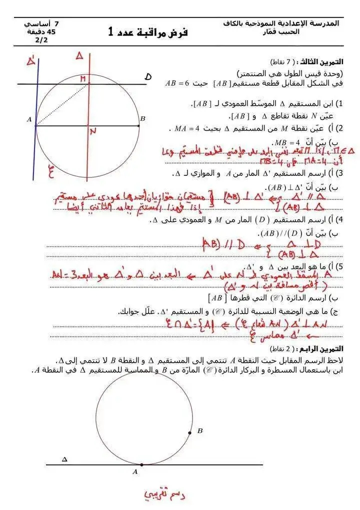 فرض مراقبة عدد01 في مادة الرياضيات السنة السابعة مرفق بالاصلاح