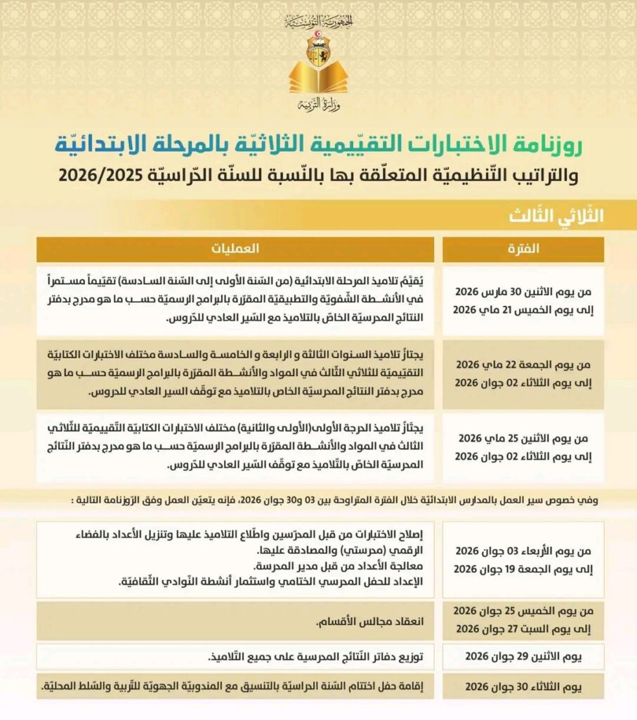 ✅روزنامة الإختبارات التقييمية الثلاثية بالمدارس الابتدائية للسنة الدراسية 2026/2025